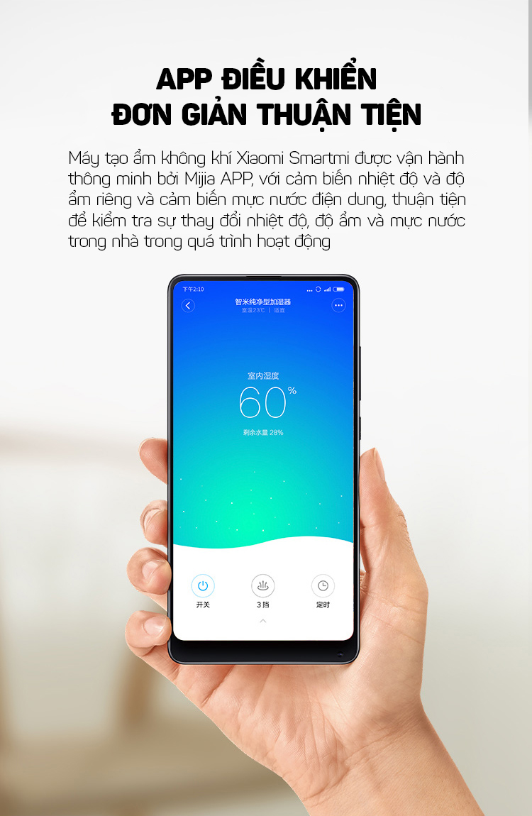 Máy tạo độ ẩm không khí Xiaomi Smartmi CJXQ04ZM có thể điều khiển được thông qua ứng dụng Mi home để làm ẩm không khí trong nhà bất cứ lúc nào và bất cứ nơi đâu. Thậm chí có thể kiểm tra độ ẩm của căn phòng. Hơn nữa có thể liên kết Smartmi CJXQ04ZM với các sản phẩm thông minh khác trong nhà thông qua APP. Ngoài ra, máy còn có thể điều khiển bằng giọng nói thông qua loa Xiaomi AI.